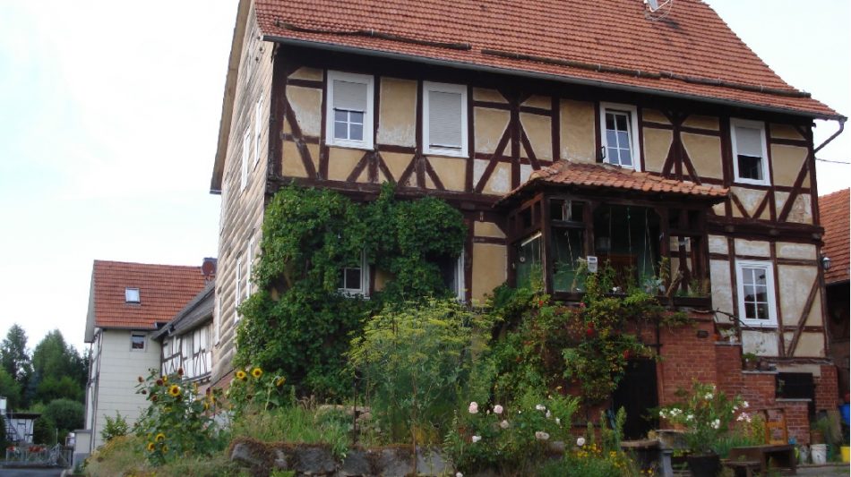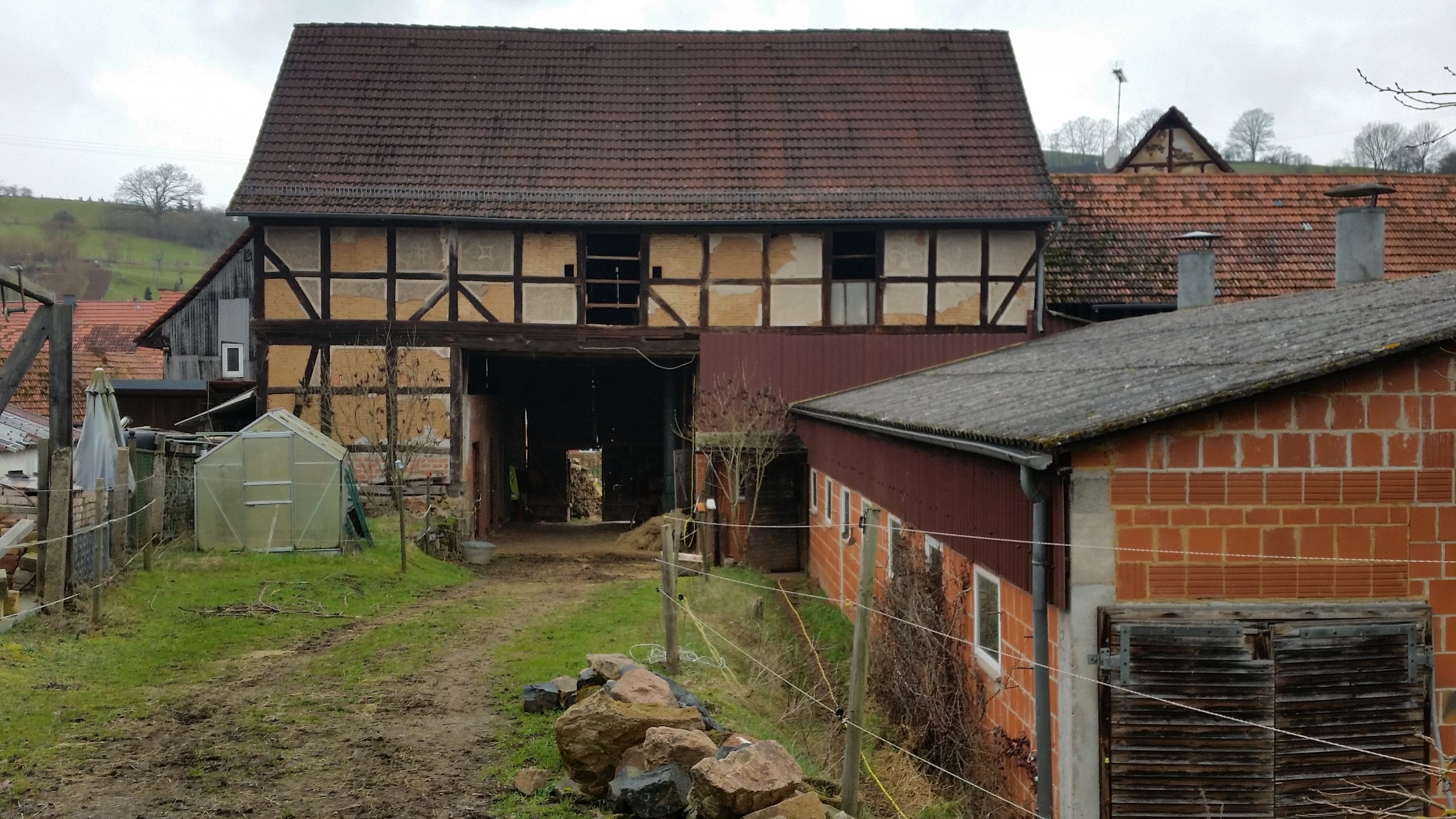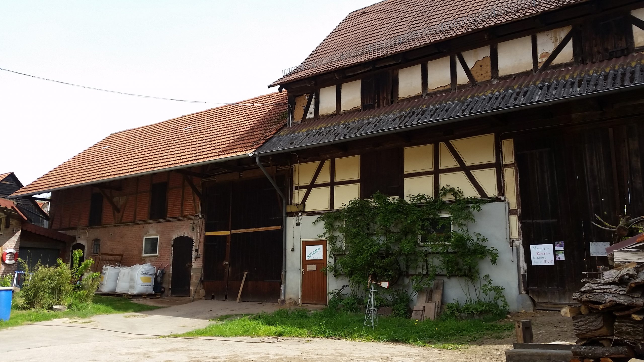 Der Hof besteht aus einem großen Fachwerkwohnhaus, Scheune und Stallungen, sowie einem großen Garten mit Gewächshaus und einer Halle für Maschinen und Strohlager.